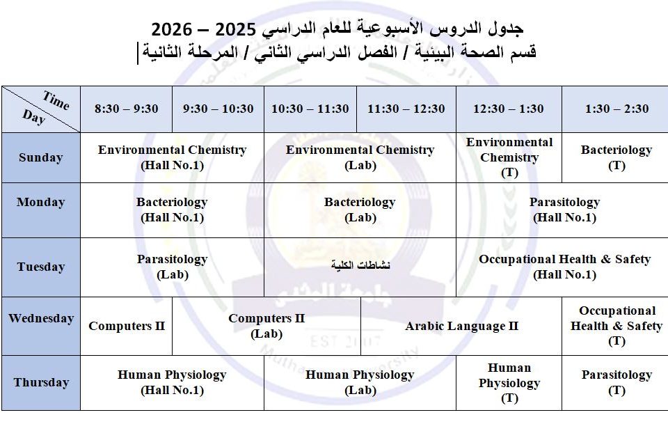 اعلاه جدول الدروس الاسبوعي للمرحلة الثانية الفصل الدراسي الثاني