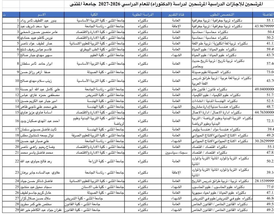 أسماء المرشحين من منتسبيها لنيل الإجازات الدراسية (الماجستير والدكتوراه) للعام الدراسي 2026–2027،