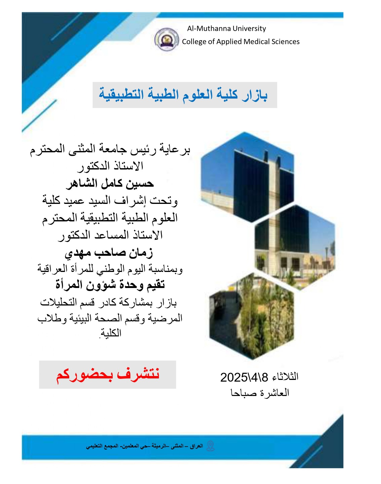 حملة تجهيز سلات غذائية رمضانية5 أبريل، 2025بازار كلية العلوم الطبية التطبيقية7 أبريل، 2025 Published by on 7 أبريل، 2025 Categories الاعلانات Tags Share0 Related posts14 أبريل، 2026معاً نحو مستقبلٍ آمن… بعيداً عن مخاطر الهجرة غير الشرعية.Read more12 أبريل، 2026الحد من الهجرة غير الشرعيةRead more30 يناير، 2026اعلاه جدول الدروس الاسبوعي للمرحلة الثانية الفصل الدراسي الثانيRead more اترك تعليقاً إلغاء الردلن يتم نشر عنوان بريدك الإلكتروني. الحقول الإلزامية مشار إليها بـ *التعليق * الاسم * البريد الإلكتروني * الموقع الإلكتروني احفظ اسمي، بريدي الإلكتروني، والموقع الإلكتروني في هذا المتصفح لاستخدامها المرة المقبلة في تعليقي.
