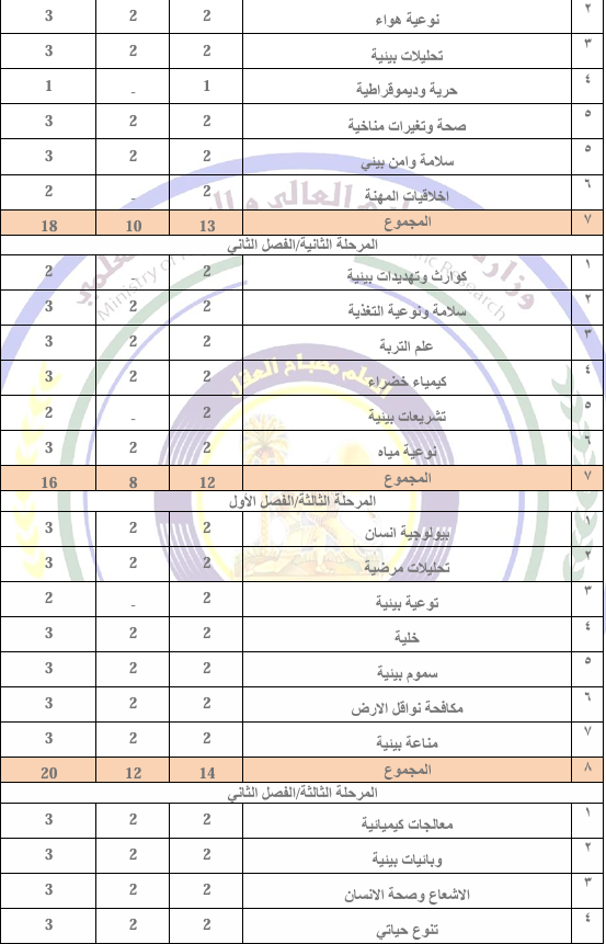 • وزارة التعليم العالي والبحث العلمي• الدوائر البيئية التابعة للوزارات التالية: وزارة الزراعة، وزارة الصحة، وزارة الصناعة والمعادن، وزارة النفط، وزارة الكهرباء، وزارة البلديات والاشغال العامة.