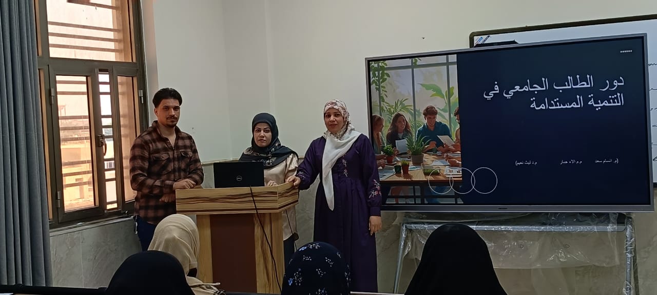 اقامت وحدة CBRN وضمن نشاطاتها للعام الدراسي 2025_2026 ندوة بعنوان ( دور الطالب الجامعي في التنمية المستدامة و المساهمة الفاعلة في تحسينها ) وحاضر فيها كل من م. انسام سعد عبد الهادي و م.م. الاء جبار محمود و م.د ليث نعيم حسوني وذلك يوم الاثنين المصادف 2025/11/24 تهدف الندوة إلى توعية الطلبة بمفهوم التنمية المستدامة و اهمية دورهم المحوري في دعمها وتحفيزهم على المشاركة الفاعلة في الأنشطة والمبادرات التي تسهم في تحسين البيئة الجامعية والمجتمع من خلال تبنّي سلوكيات وحلول مستدامة.